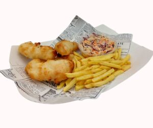 470g: ryba w cieście, frytki, surówka colesław