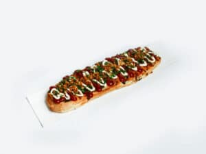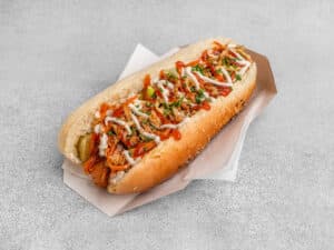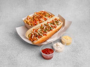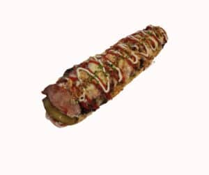 z kiełbasą z szynki, w chrupiącej maślanej bułce, z dodatkiem marchewki po koreańsku, sałatki szwedzkiej, kapusty pekińskiej i autorskich sosów