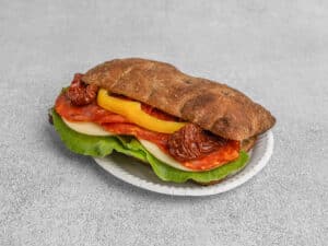 bułka schiacciata, chorizo, ser salami, suszone pomidory, papryka, sałata