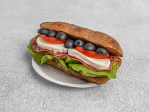 bułka schiacciata, serek z dodatkiem bazyliowego pesto, ser mozzarella, włoskie salami, pomidor, sałata, oliwki