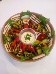 grillowany ser halloumi, mix sałat, ogórek, pomidorki koktajlowe, papryka, czerwona cebula, granat, jogurtowy sos z dodatkiem śródziemnomorskich ziół