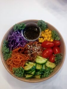 filet z sosem teriyaki, mix sałat, marchewka po koreańsku, czerwona kapusta, pomidorki koktajlowe, ogórek, kukurydza, pomarańcza, sezam, orientalny sos